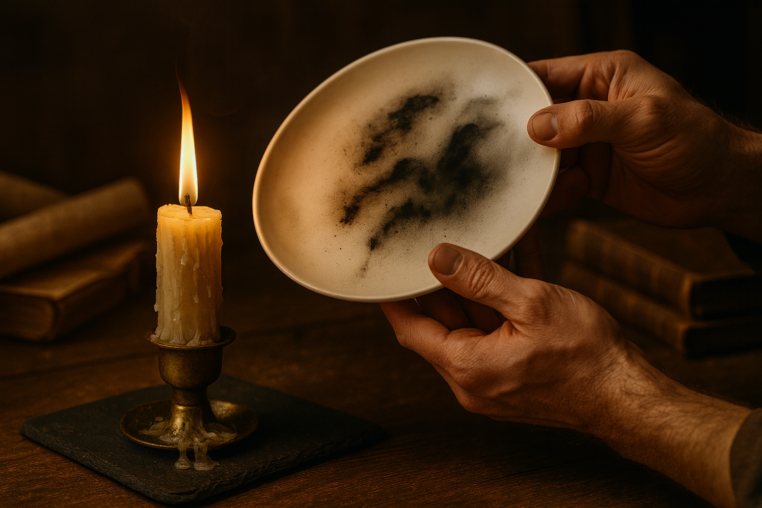Wax and flame speak through form and shadow. I read water-cast wax drippings, natural candle-flow formations, and the delicate script of soot patterns collected above a flame. Each carries its own vocabulary of symbols—ridges, clusters, silhouettes, openings, and distortions—that show what is forming around your question, what is dissolving, and what stands at the center of your current path.
